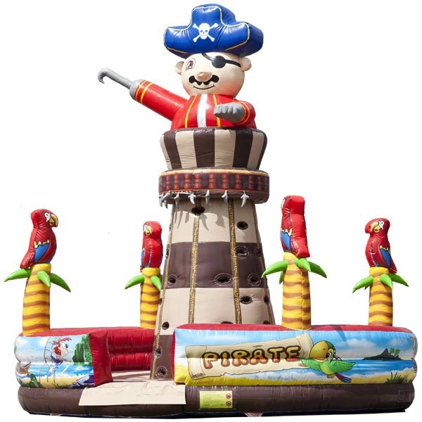 Deze Klimtoren Piraat is een echte aanrader! Met de stoere piraat op de toren is dit een geweldige eye-catcher op elk evenement. Probeer zo snel mogelijk naar boven te klimmen om de zwaarden te pakken. Deze opblaasbare attractie valt al van een afstand op door de enorm grote en stoere piraat boven op de toren. De attractie heeft onderaan de klimtoren een valmat en hoge opstaande randen die uitgerust zijn met vrolijke papegaaien.