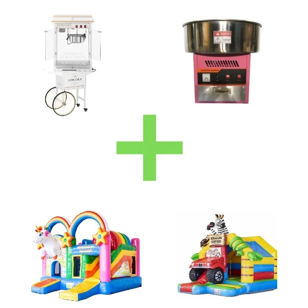 Dit pakket biedt alles voor een onvergetelijke feestdag! Geniet van urenlang springplezier op twee grote springkussens en maak het feest compleet met een popcorn- en suikerspinmachine voor de lekkerste traktaties. De kinderen kunnen zich uitleven op de kussens en tegelijkertijd genieten van heerlijke snacks. Het is de ideale manier om beweging en lekkernijen te combineren voor een geslaagd evenement of schoolfeest.