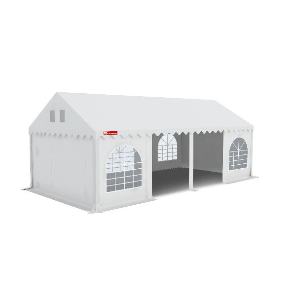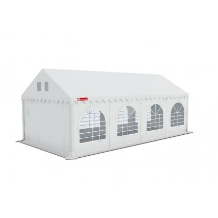 Sterke Stabiele waterdichte partytent 8x4 meter, Brandvertragend gecertificeerd klasse 1 volgens NEN norm6065, M2, En13501 Het zeil is gemaakt van sterk PVC met een gewicht van 500 gr per m², wat vergelijkbaar is met vrachtwagenzeil. Door de thermisch gelaste naden van het zeil is deze tent nog beter bestand tegen wind, en 100% waterdicht. De zijwanden zijn voorzien van extra tocht/modderflappen en voorzien van vierkante vensters, wat veel licht doorlaat.